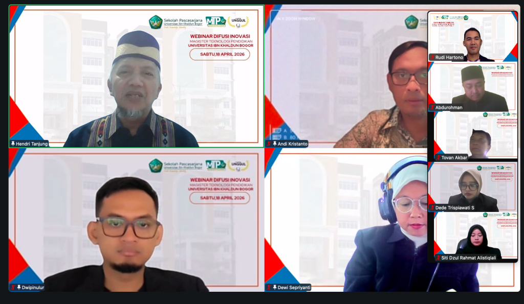 Bogor, 18 April 2026 – Program Studi Magister Teknologi Pendidikan Universitas Ibn Khaldun (UIKA) Bogor sukses menyelenggarakan Webinar Difusi Inovasi Berbasis Aplikasi pada hari Sabtu, 18 April 2026. Kegiatan yang berlangsung secara daring ini diikuti oleh 260 peserta dari berbagai latar belakang keilmuan, mulai dari akademisi, pendidik, mahasiswa, hingga praktisi teknologi pendidikan.